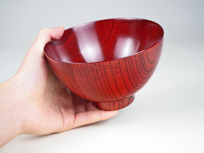 木製のお椀の良いところは、熱を伝えにくいので手に持っても熱さを感じません。またこのサイズのお椀でもとても軽く、フチが薄いので口当たりもいいです。